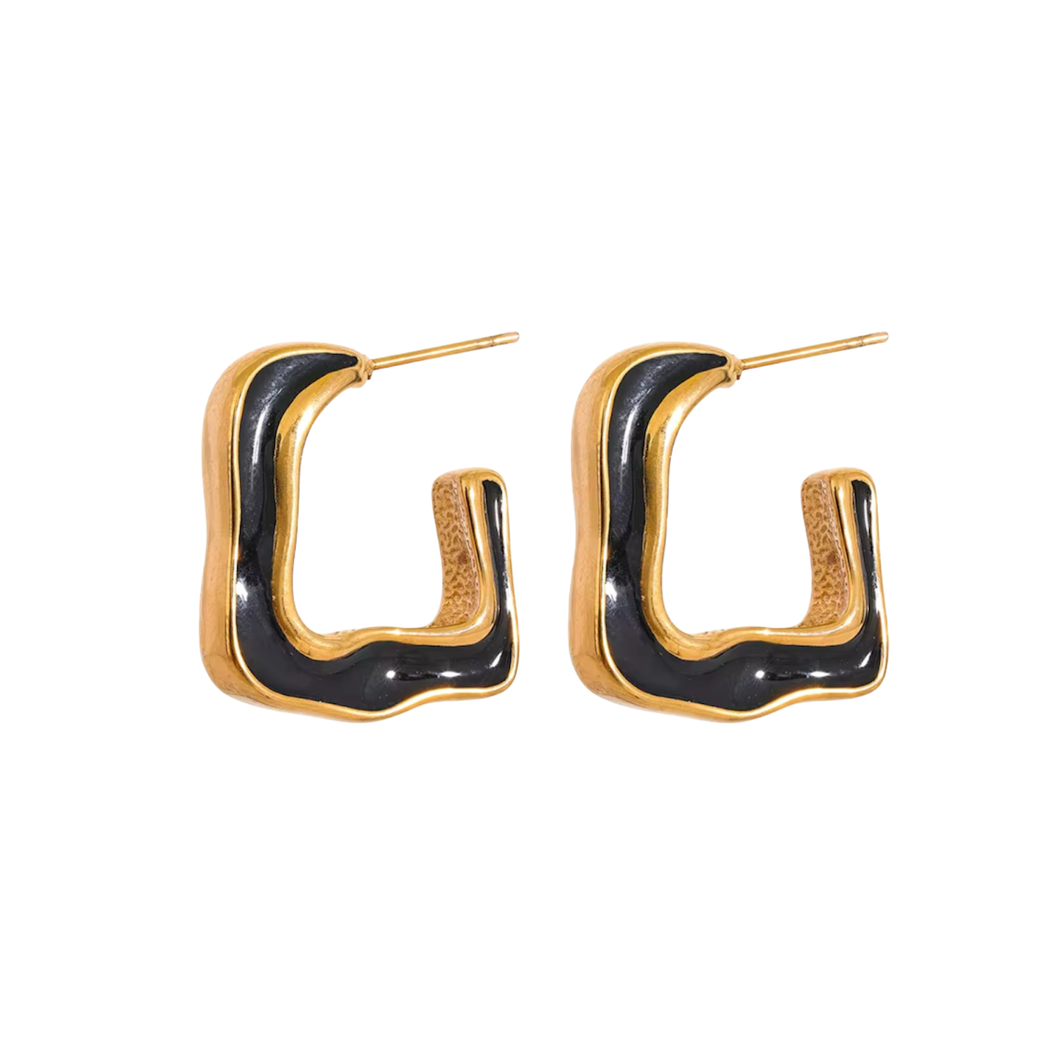 The Agar earrings feature a striking geometric design. The gold-toned part has a smooth, glossy finish. The design is abstract and angular, resembling modern art or symbolic letterforms, making these earrings a unique and contemporary accessory. They are perfect for someone looking to add a distinctive, artistic touch to their jewelry collection.