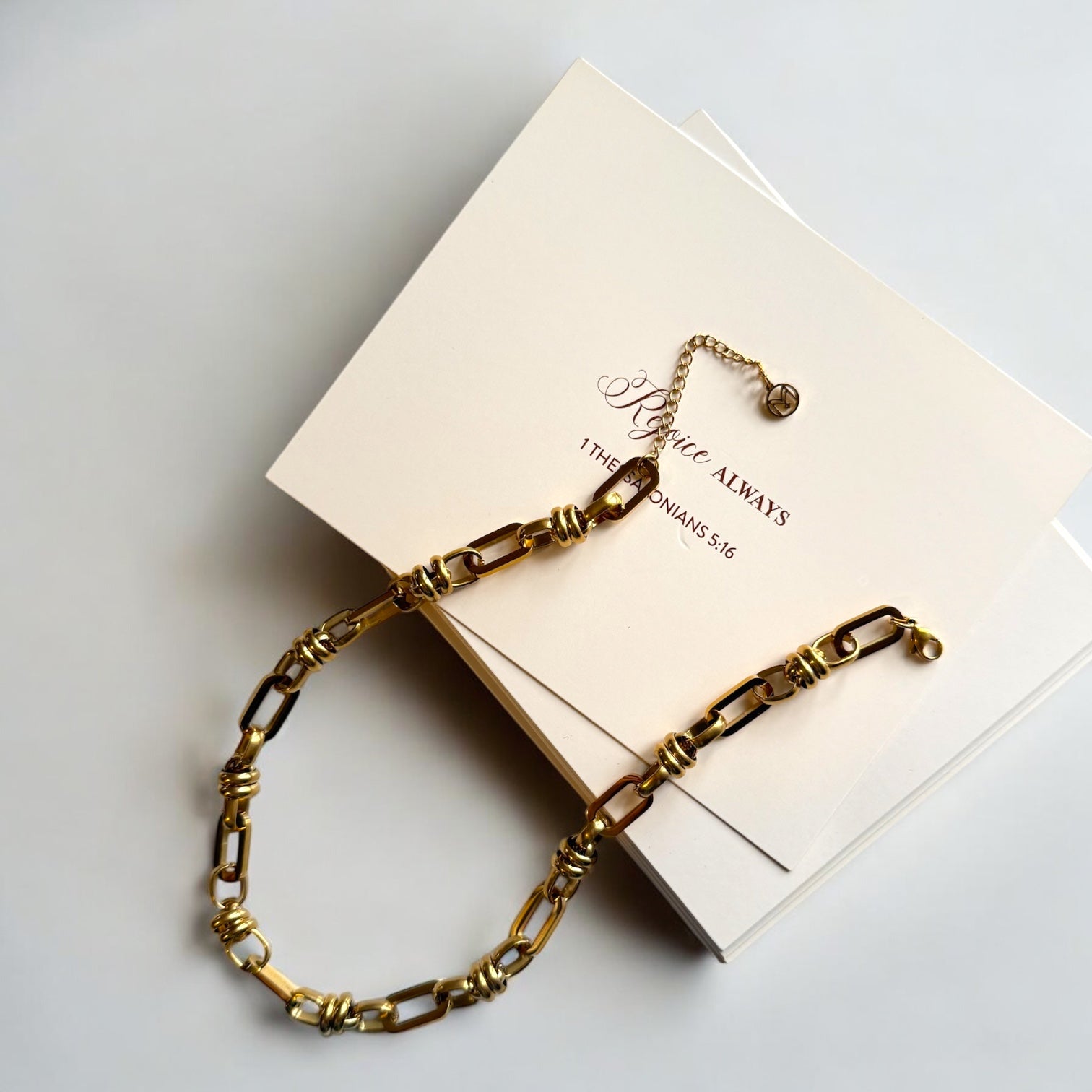 The DuBois Necklace is a striking fusion of boldness and refinement. Featuring sleek rectangular links connected by delicate circular rings, its geometric elegance makes a powerful statement. The adjustable chain and clasp ensure versatility, allowing you to style it effortlessly for any occasion. Whether layered or worn solo, this modern masterpiece redefines sophistication with a unique, eye-catching presence.