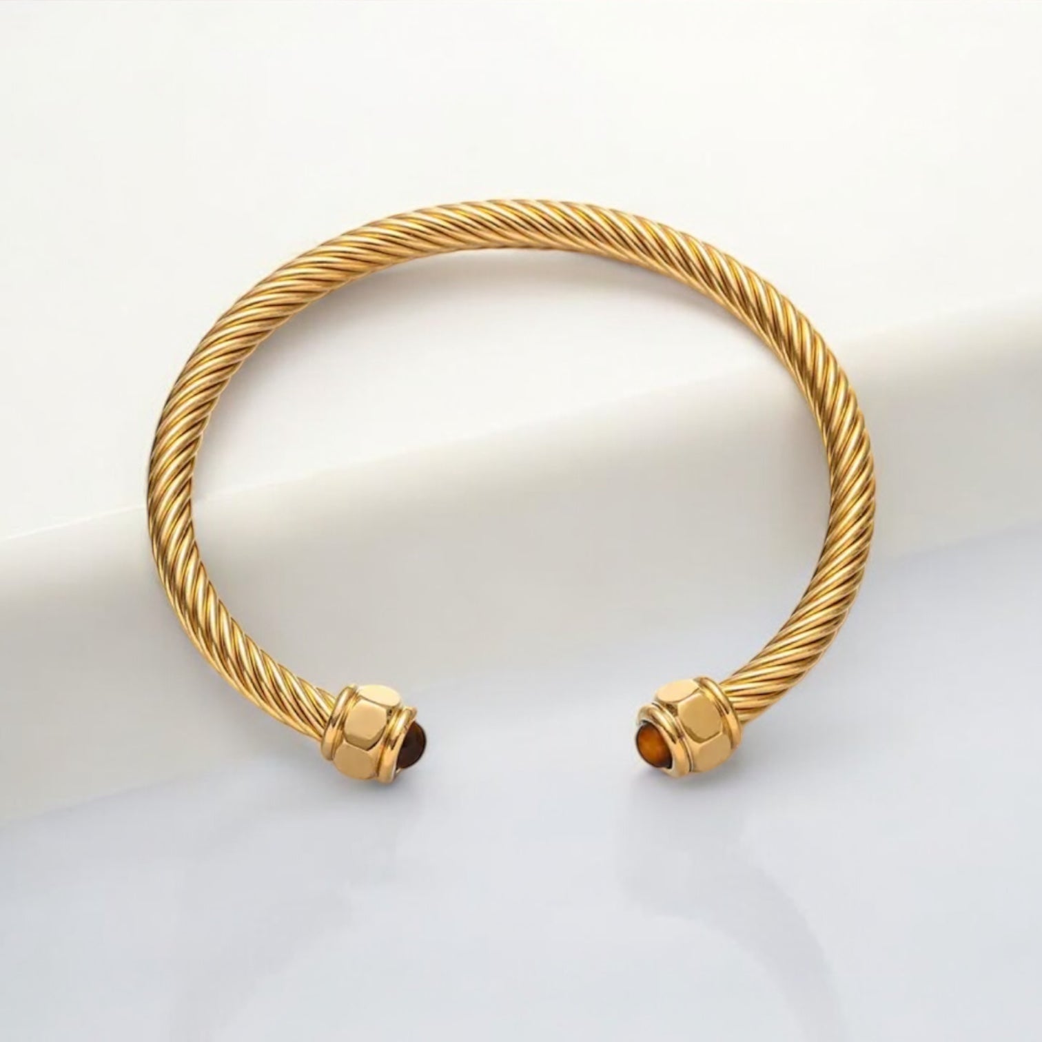 Embrace timeless elegance with the Eternal Bangle. This gold bangle features a twisted rope design, highlighted by two decorative end caps adorned with small, round tiger eye stones. Perfect for adding a sophisticated touch to any ensemble.