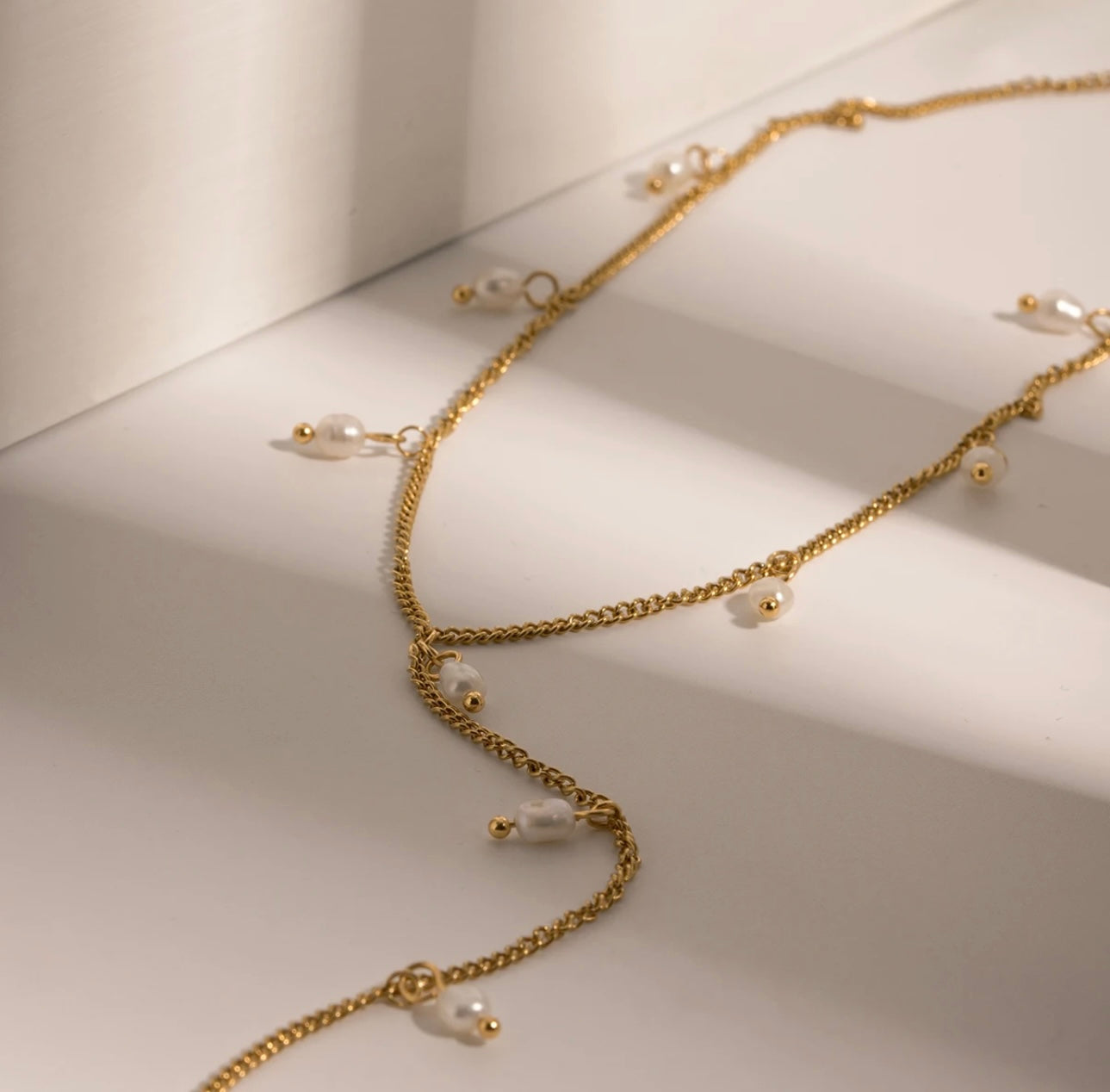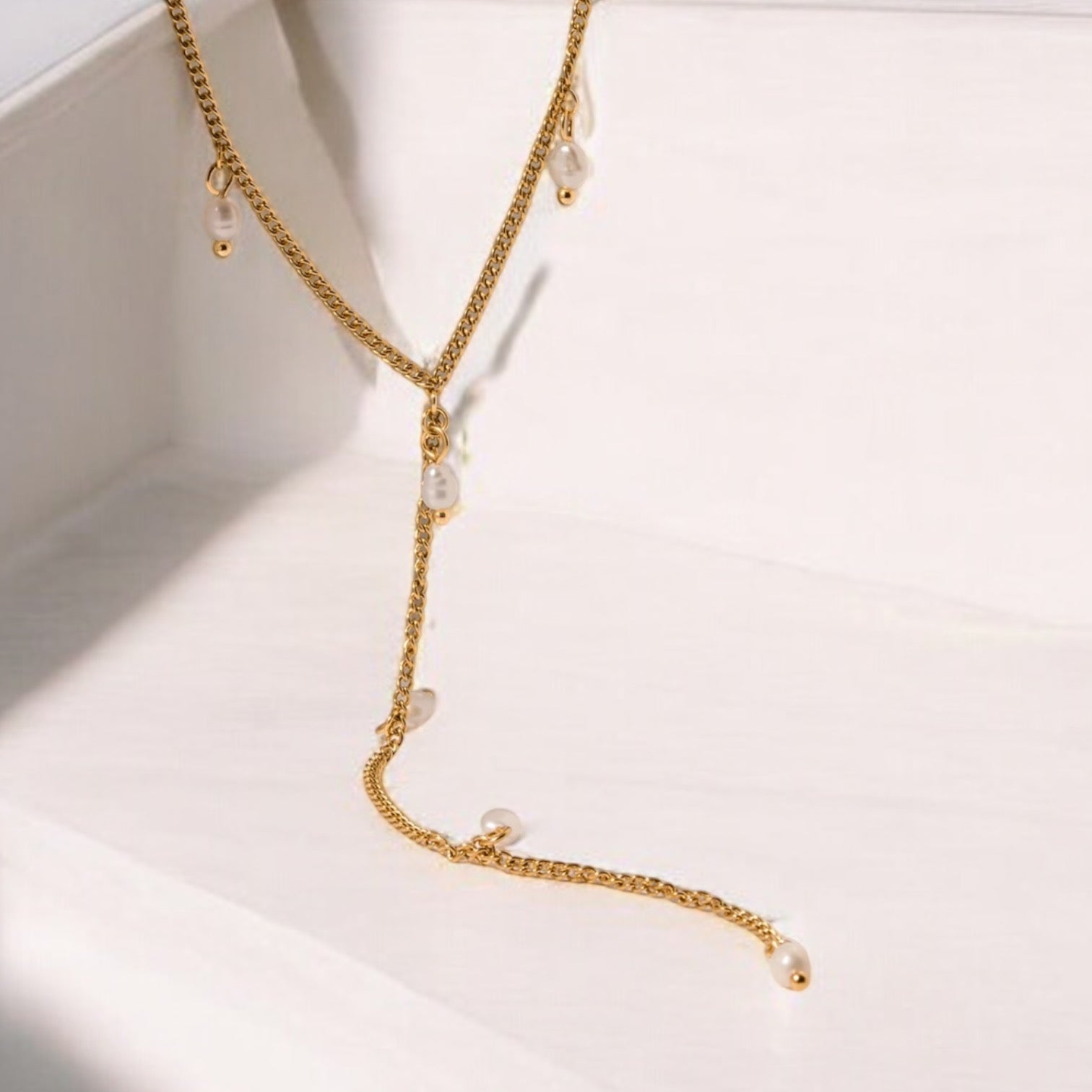 Delight in the elegance of the Gaviota Necklace. This stunning gold chain features delicate white pearl-like beads spaced evenly along its length, adding a touch of timeless beauty. Perfect for any occasion, the Gaviota Necklace effortlessly complements your style with its refined and sophisticated design.
